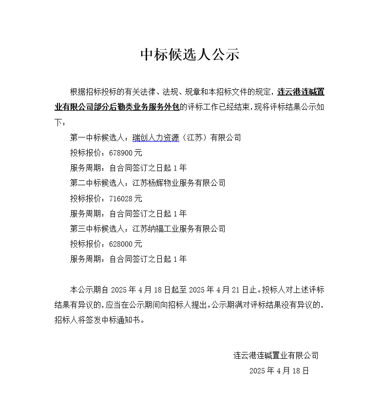 連云港連堿置業(yè)有限公司部分后勤類業(yè)務服務外包中標候選人公示
