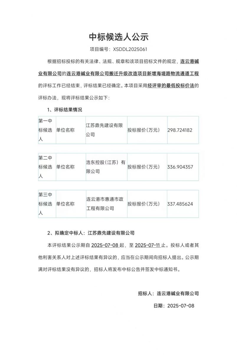搬遷升級改造項目新增海堤路物流通道工程中標候選人公示