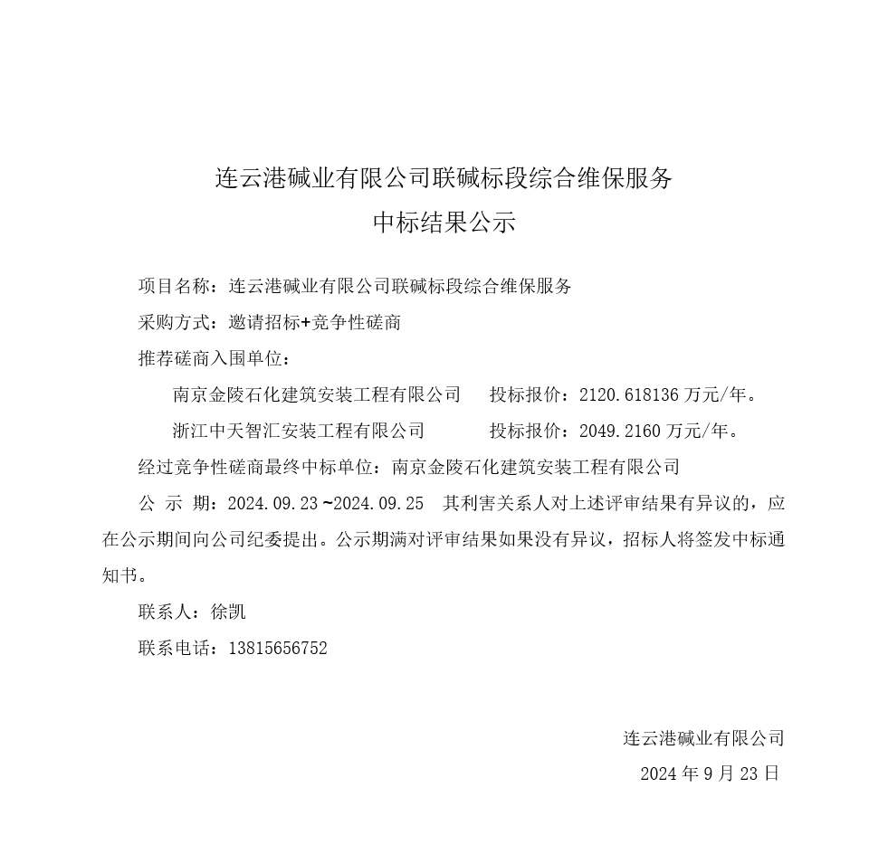 聯(lián)堿標段綜合維保服務(wù)中標結(jié)果公示