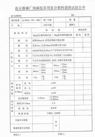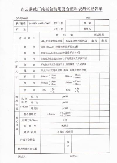 5.6 其他主要資格要求:具有合法有效的生產(chǎn)許可資質(zhì),企業(yè)制度完善、質(zhì)量管理規(guī)范,具有完整的拉絲、織布、縫紉、檢測等生產(chǎn)線,注冊資金不少于500萬元(人民幣)。食品包裝袋投標人應具備食用包裝物生產(chǎn)許可資質(zhì),并提供第三方檢測報告。投標人必須送樣品袋先經(jīng)我公司質(zhì)檢部門檢測合格(2018年10月20日之前送到連云港堿業(yè)有限公司供應部,原招標人供應商不需送樣品袋)。符合法律、法規(guī)規(guī)定的其他條件。