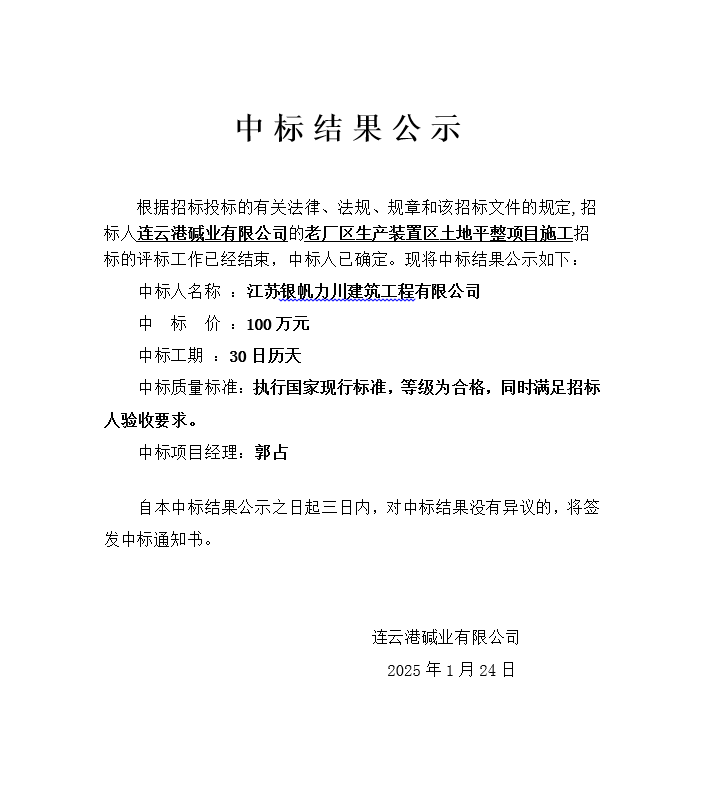 老廠區(qū)生產(chǎn)裝置區(qū)土地平整項目施工中標結(jié)果公示